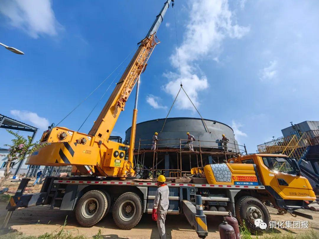 項目完工投用后,每年可處理選礦廢水247.5萬立方米、酸性廢水1000萬立方米,去除COD1485噸、硫化物146.03噸、重金屬錳208噸,在保障原生產線正常運行的同時,顯著降低相關污染物排放,實現外排水水質穩定達標,有效保護當地水環境,環境效益和社會效益顯著。上圖為吊裝作業現場。